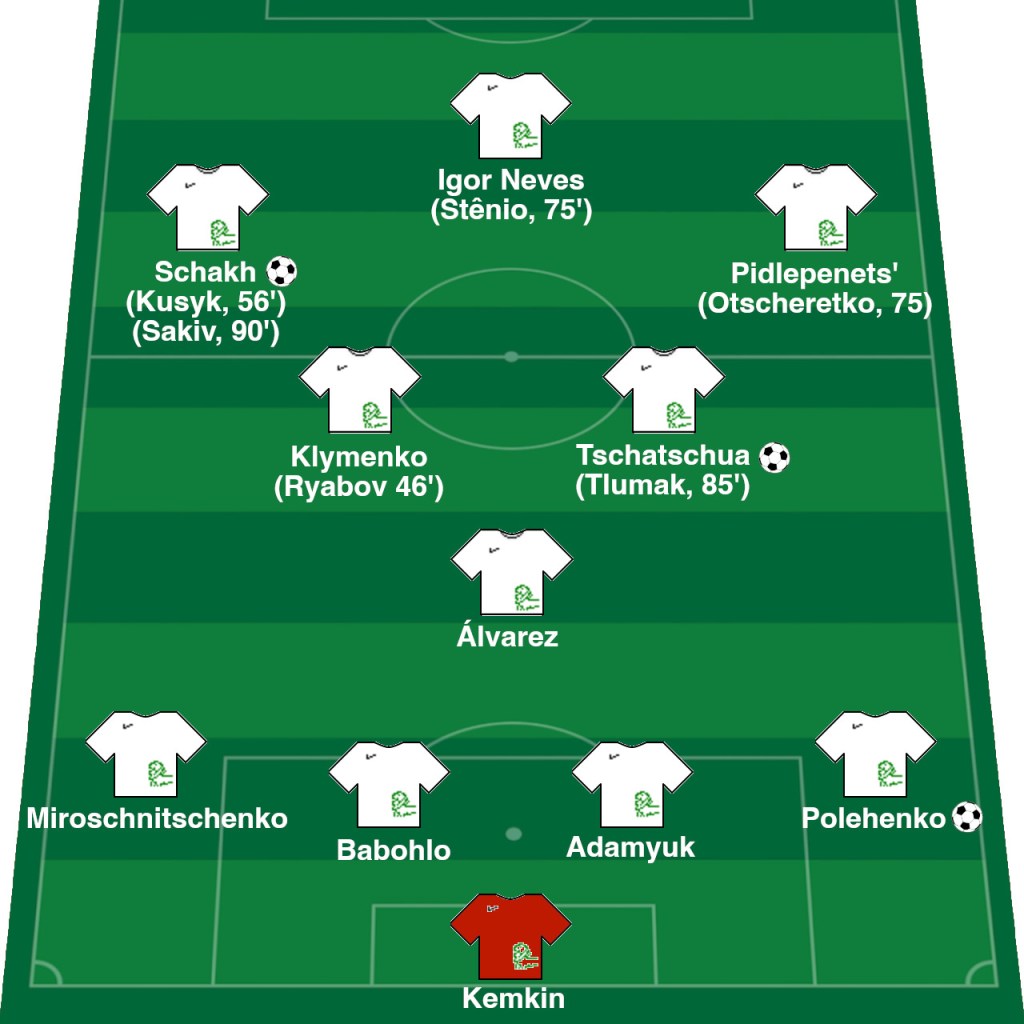 Trainer Lupaschko musste heute ohne Yan Kostenko auskommen, der nach seiner gelbroten Karte letzte Woche für ein Spiel gesperrt ist. Für ihn kam Schakh zu seinem UPL-Stardebut. Das Spielsystem war wieder ein 4:3:2:1, und es gab ansonsten noch einige kleinere Änderungen, etwa mit Polehenko statt Sakiv in der Außenverteidigung und Klymenko stat Kusyk im Mittelfeld: