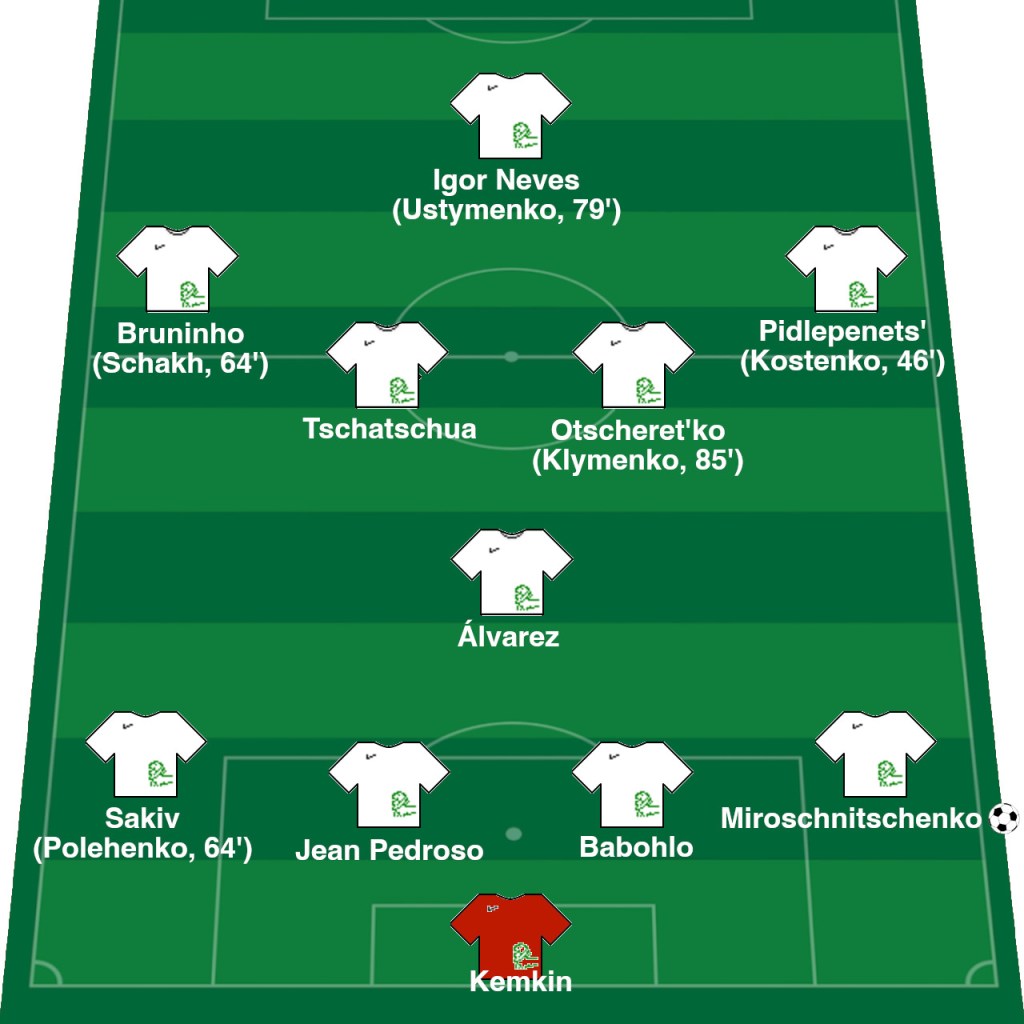 Trainer Lupaschko ließ sein gewohntes 4:1:4:1 spielen. Der aufgrund seiner gelbroten Karte vom letzten Wochenende fehlte Volodymyr Adamyuk, dessen Platz in der Innenverteidigung neu besetzt werden musste. Es fiel auf, dass Stênio überhaupt nicht im Kader war. Der Grund dürfte in der Verletzung liegen, die er sich beim letzten Spiel gegen Tschornomorets‘ zugezogen hatte – er hatte zwar weiter gespielt, aber es sah doch böse nach einem Nasenbeinbruch aus. In der Startaufstellung standen: