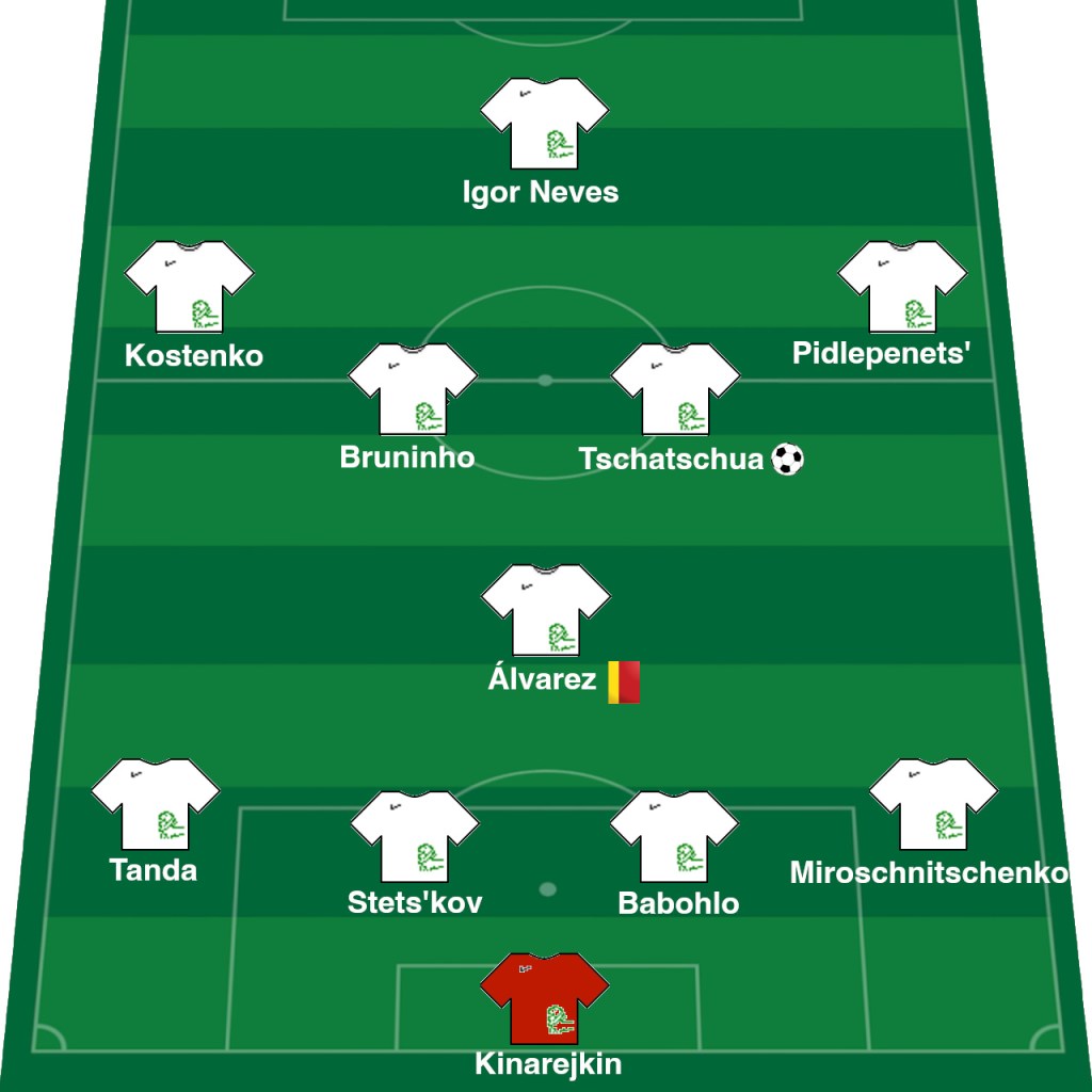 Im weiteren Verlauf des Spiels kamen noch Oleh Otscheret’ko (Yevhen Pidlepenets‘), Volodymyr Adamyuk (Patricio Tanda), Pavlo Polehenko (Tymur Stets’kov), Ihor Krasnopir (Igor Neves), Oleh Fedor (Yan Kostenko) zum Einsatz.
