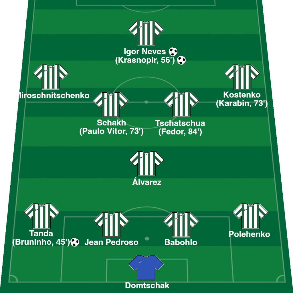 Karpaty wurden nun aktiver und begannen, in der Hälfte der Gäste aufzutauchen. Das hatte dann sogar auch nach kurzer Zeit zählbare Folgen – nach einem schönen Steilpass von Álvarez auf Igor Neves an die Strafraumgrenze ging der nach einer schönen Körpertäuschung an einem Innenverteidiger vorbei und verwandelte mit einem wunderschönen Flachschuss ins linke Eck aus etwa 12 Metern zum 1:1. Das war unerwartet und eröffnete natürlich wieder die Möglichkeit taktischer Varianten.