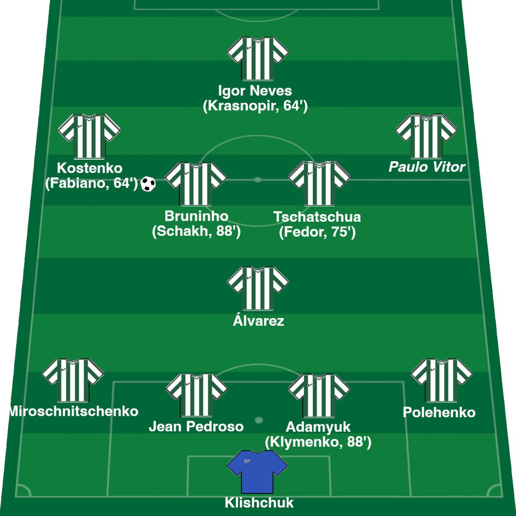 Während des Spiels kamen noch Fabiano (Yan Kostenko), Ihor Krasnopir (Igor Neves), Oleh Fedor (Ambrosij Tschatschua), Artur Schakh (Bruninho), Vladyslav Klymenko (Volodymyr Adamyuk) zum Einsatz.