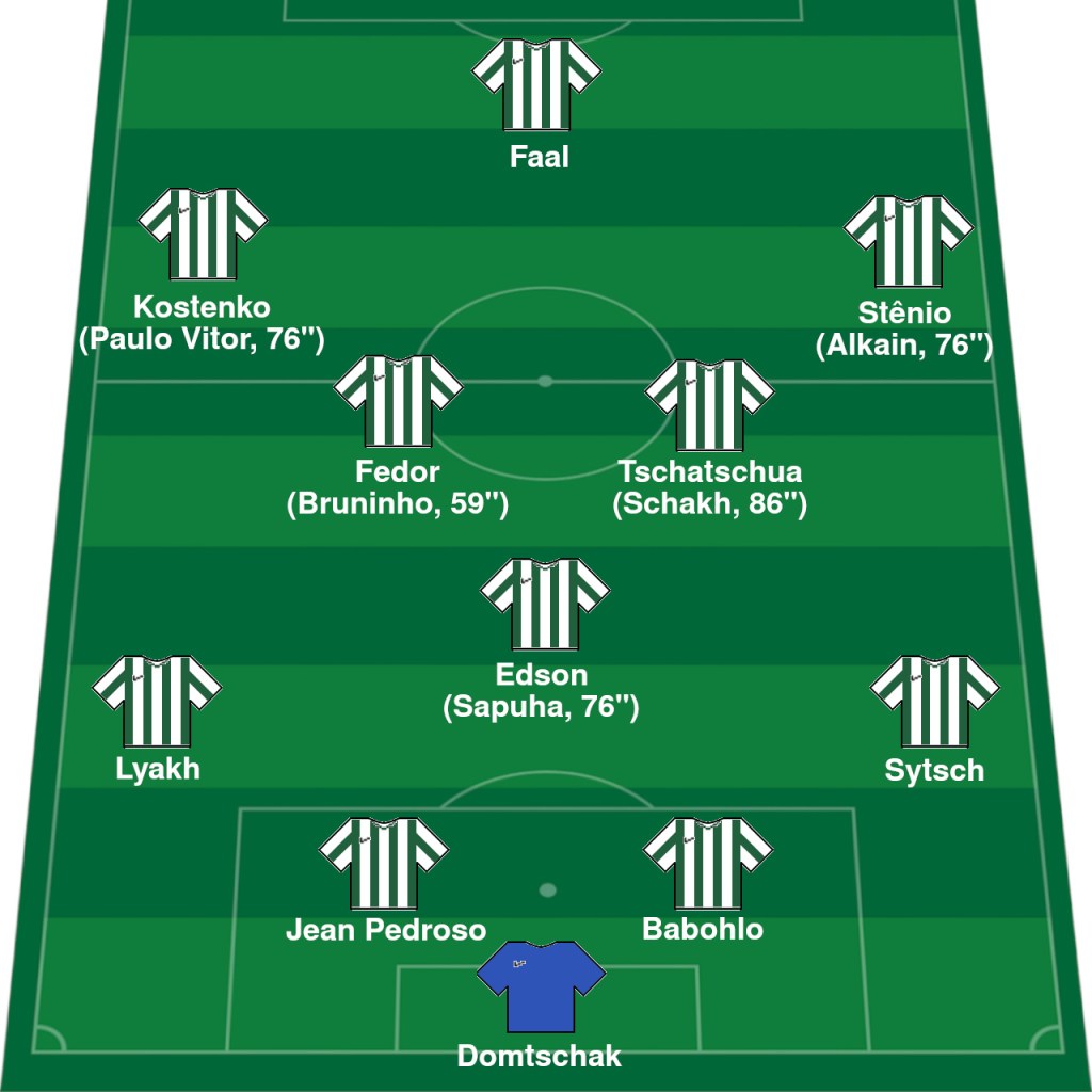 Die Formation heute sah aus wie ein 4:3:2:1 mit Edson allein auf der „6“ sowie Tschatschua und Fedor im zentralen Mittelfeld, davor die Flügelspieler und Faal als Spitze: